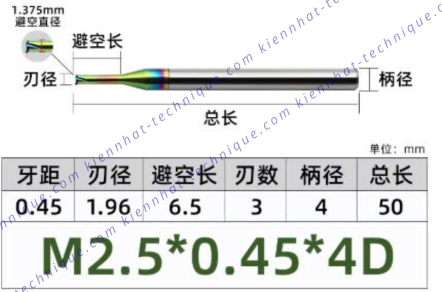 Dao phay ren hợp kim phủ DLC (nhôm) 0.45*6.5*50*4 P0.45 (1 răng)