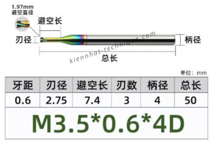 Dao phay ren hợp kim phủ DLC (nhôm) 0.6*7.4*50*4 P0.6 (3răng)