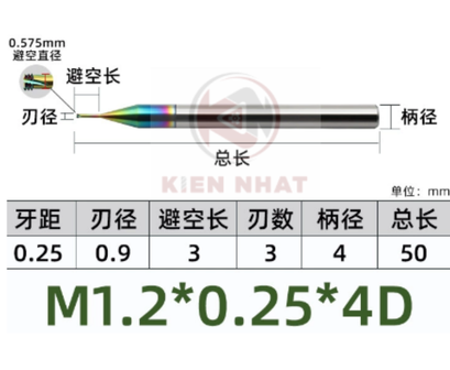 🔧 Dao phay ren nhôm M1.2×0.25 – 3 răng