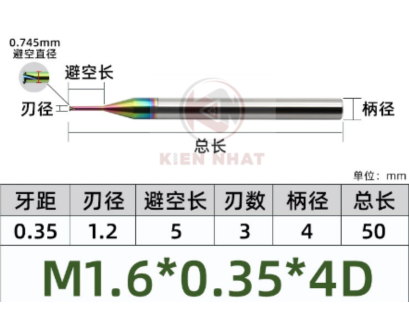 🔧 Dao phay ren nhôm M1.6×0.35 (1.2×5×50×4) – 1 răng