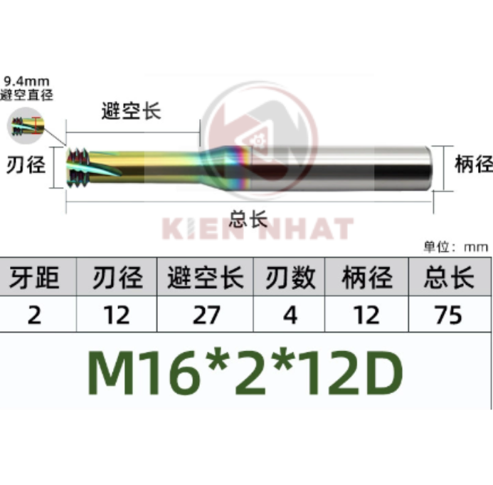 🔩 Dao phay ren nhôm M16×2 (12×45×75×12) – 3 me