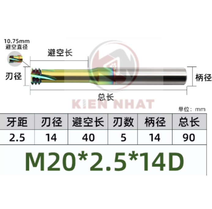🔩 Dao phay ren nhôm M20×2.5 (14×40×90×14) – 3 me