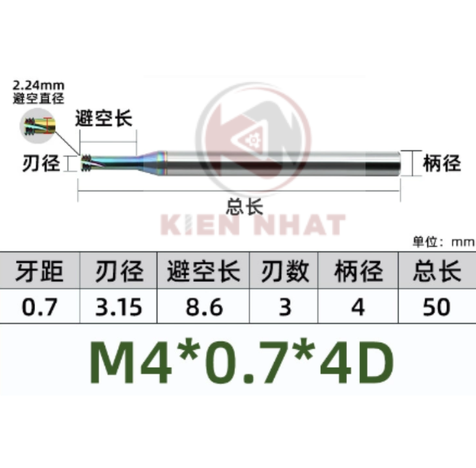 🔩 Dao phay ren nhôm M4×0.7 (3.15×10×50×4) – 3 me