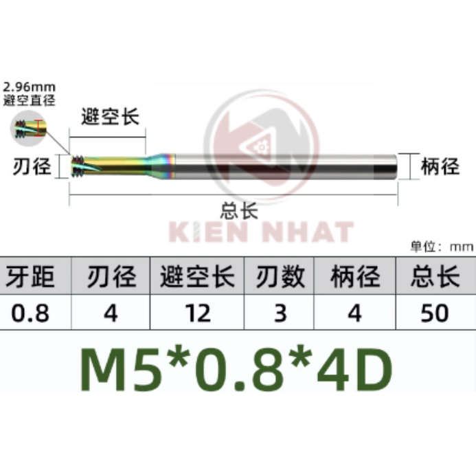 🔩 Dao phay ren nhôm M5×0.8 (4×12×50×4) – 3 me