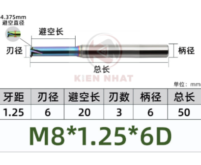 🔧 Dao phay ren nhôm M8×1.25 – 1 răng