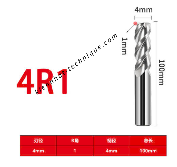 Dao phay trụ cầu nhôm D4 (R1) × 25 × 100 × 4 – 3F