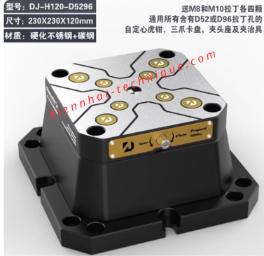 Đế lắp ê tô tự định tâm DJ‑H120‑D5296 là phụ kiện nâng cao dạng zero point quick change base dùng để gá nhanh ê tô tự định tâm hoặc đồ gá CNC lên bàn máy.